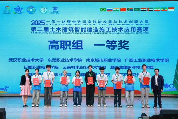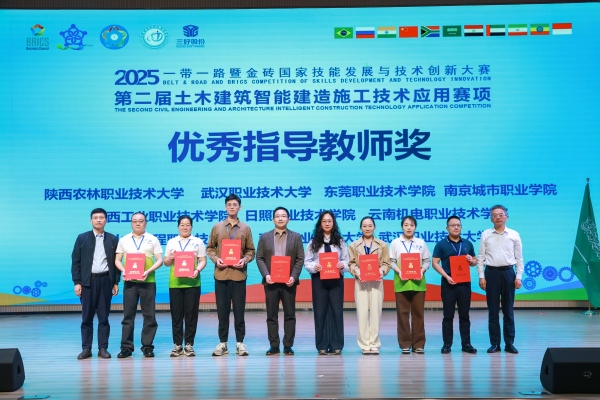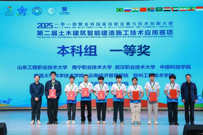 新闻网讯(通讯员武敬)10月19日,2025一带一路暨金砖国家技能发展与技术创新大赛——第二届土木建筑智能建造施工技术应用赛项在重庆圆满落幕。武汉职业技术大学建筑工程学院学子表现卓越,熊啸天、邱文熙组成的本科组代表队,毛彦旭、梅鑫组成的高职组代表队分别以全国排名第三和第十三的优异成绩,双双斩获一等奖。王冰、赵亮、江俐敏荣获“优秀指导教师”称号,学校荣获本科组和高职组“最佳组织奖”。值得一提的是,武汉职业技术大学是本届赛事中唯一在本科与高职两个组别均获一等奖的院校。