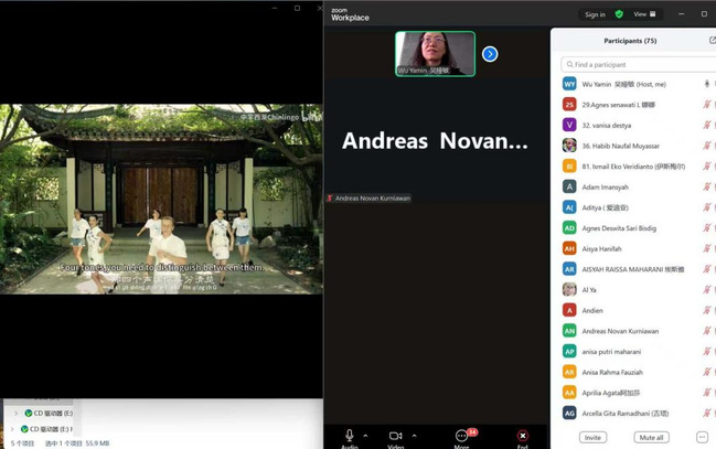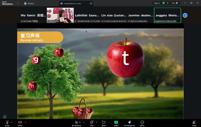 新闻网讯(通讯员李亮、汪洋)10月27日下午,武汉职业技术大学外语外贸学院教师黄小蕊通过“Zoom”平台为印尼苏更哈尔托诺大学专业学生开展线上中文课一一屏幕上,她用动画演示带领学生复习声母“b、p、m、f,d、t、l、n,g、k、h”的拼读规则;另一端,印尼学生Aisya Hanifah举着笔记本提问“那apple怎么用中文说?”互动评论区,“开心!这个发音我学会啦”等弹幕不停滚动。这堂互动频频的中文课,正是两校联合开展中文国际教学项目的日常教学场景。
