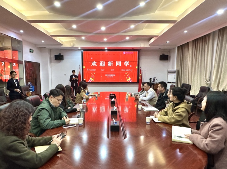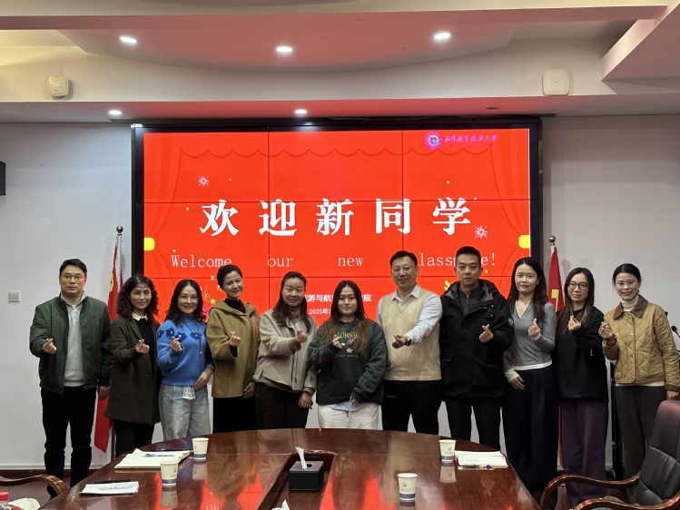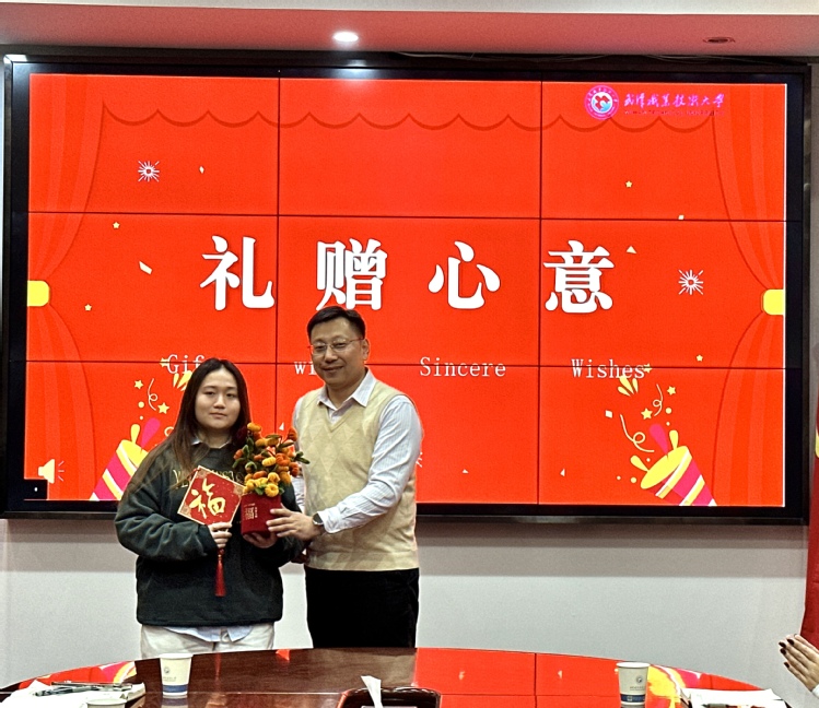 赠礼环节传递着真切关怀:学校对外合作与交流处处长张子一送上含专业核心教材、纪念笔记本的学习大礼包,为阿丽学业助力;蒋永业院长送上“柿柿如意”盆栽与“福”字贴,寄寓顺遂祝愿;旅航学院党委书记谢丽递上吉祥娃娃与健身锤,传递平安康健的期许。全体师生合影留念,将这份跨国情谊定格。