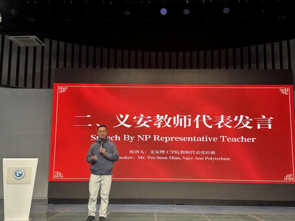 新加坡义安理工学院教师代表TEO SEOW HIAN在结业典礼上致辞