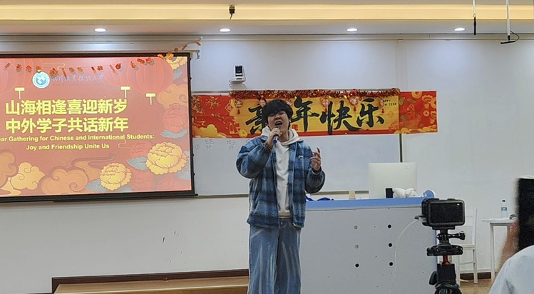精彩的文艺演出紧随其后,中外学子轮番登台,用多元艺术形式绽放青春芳华。哈萨克斯坦的韩雅娜和雷佳身着传统服饰,跳起舒展悠扬的民族舞蹈,每一个动作都透着独特韵味;越南的杨氏玉英带来歌曲《Tung Pa》,婉转的旋律里满是深情,让人沉醉;武职学子汪承骏演绎经典曲目《Besame mucho》,浪漫的歌声感染着每一个人;向玉林以一首《将故事写成我们》压轴,温柔的嗓音传递着真挚情谊,不少学生跟着轻轻哼唱。一曲一舞间,不同文化的艺术魅力碰撞交融,现场掌声不断,暖意融融。